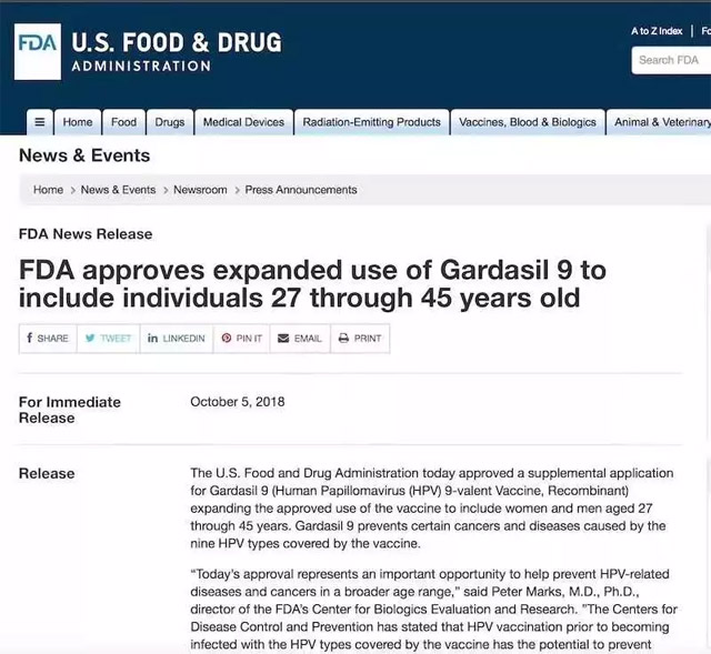 美国FDA将HPV疫苗从9~27岁扩至9~45岁: