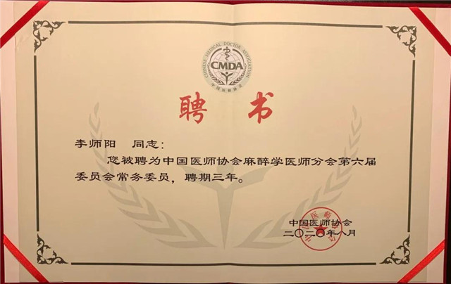 2020年8月7日,由中国医师协会、中国医师协会麻醉学医师分会主办的中国医师协会麻醉学医师分会(暨第六届委员会)在上海召开,泉州玛珂迩妇产医院李师阳总裁被聘为委员会常务委员。