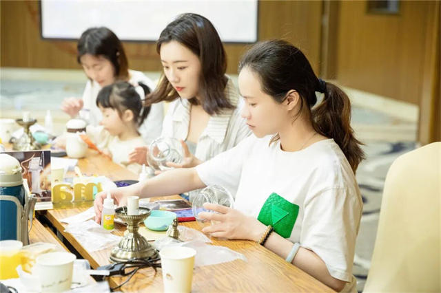 宝妈们和宝贝们专注于自己手中的烛台灯,一颗一颗的往上装饰自己心中的“画布”,每一盏灯都各不相同,独具风格,大家沉醉在手作的过程,暂时摆脱日常的烦恼,享受这片刻的宁静。