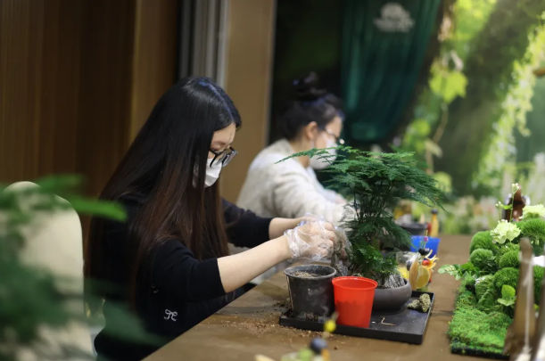 古朴陶盆、葱郁的文竹、形态各异的小石子等材料一应俱全,静静等待着宝妈们用巧手赋予它们新的生命。